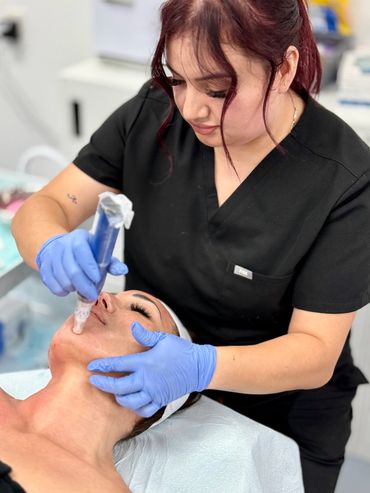 HydroGlow Facial which involves deep cleansing, hydrodermabrasion, extractions, calming mask, oxygen infused serums, & finishing products. This facial will leave your skin feeling refreshed, hydrated, & glowing. $105/75Min